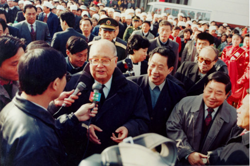 1992年12月12日上午,全国政协副主席王光英(左二),在河南项城参加河南莲花味精集团六万吨工程项目竣工暨莲花味之素开工庆典现场,接受中央电视台记者采访。
