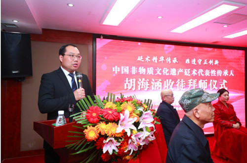 随后,中国医药教育协会中医药非遗传承工作委员会秘书长张彦朝代表见证嘉宾发言。他在发言中,对胡海涵老师多年来不忘立德树人初心,牢记为党育人、为国育才使命担当给予了高度评价。希望弟子们铭记师恩,恪守师训,入门后更要尊师重道,勤勉好学。在胡海涵老师的悉心指导下,不仅要传承砭术之精髓,更要坚守大医精诚之医德,秉持遵纪守法、团结同道、谦逊谨慎、淡泊名利的高尚情操。以博爱之心,采百家之长,努力把砭术这一祖先留给我们的宝贵财富继承好、发展好、利用好,在建设健康中国、实现中医药振兴发展中谱写新的篇章。